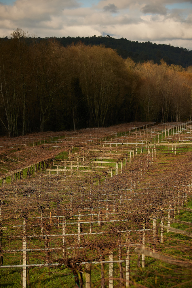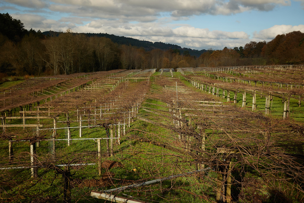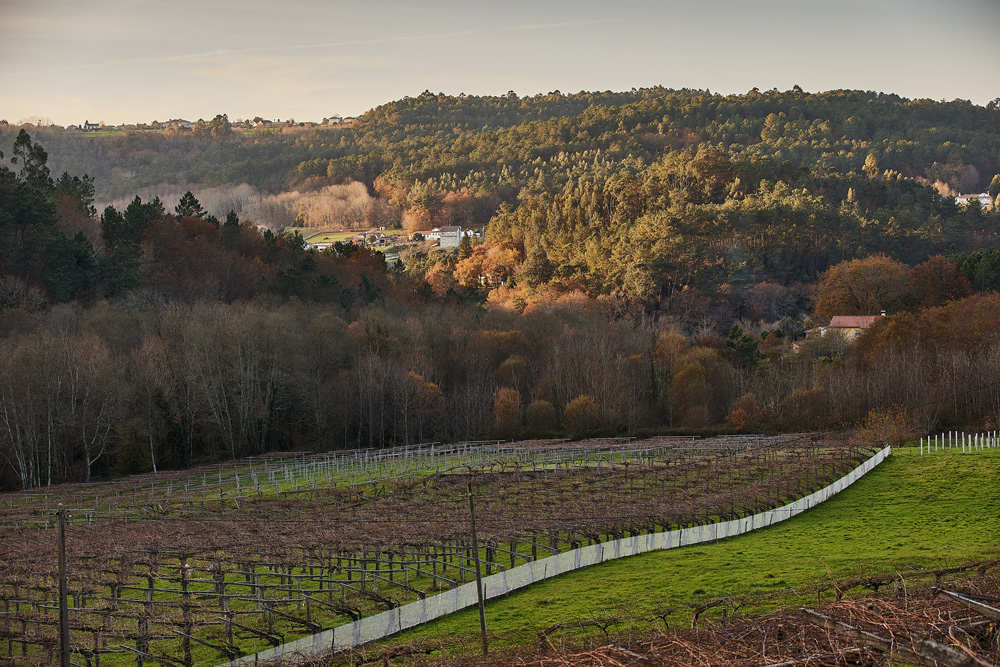 El viñedo ocupa una extensión de 9 hectáreas, plantados con diferentes variedades blancas entre las que prima la Albariño. También hay Treixadura y Godello, y entre las tintas, la Mencía, Caíño tinto, Brancellao y Sousón. La edad de las cepas oscila entre los 10 a los 60 años. Hay un clima suave suave clima atlántico ubicado a unos 100 metros sobre el nivel del mar, aunque las cepas están enclavadas en una zona de montaña. Se trata de la auténtica "viticultura del granito", donde las condiciones para la viña de uva albariño, tanto edafológicas, como climatológicas, son inmejorables.